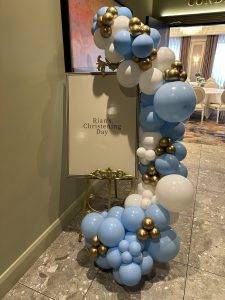 We styled the entrance with a balloon display in baby blue, ivory and soft metallic tones. This framed a personalised sign on a gold easel and gave guests a warm welcome as they arrived. The colour mix worked beautifully for a christening because it felt soft, bright and timeless at the same time.