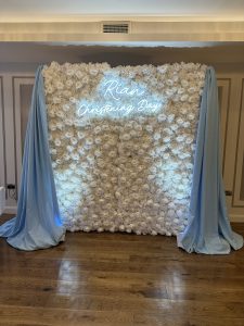 One of the main statement pieces for the room was an ivory flower wall dressed with soft baby blue draping. We finished the backdrop with a custom-made neon sign for Rian’s Christening Day, which added a modern and personal touch to the setup. The ivory flower wall gave the space texture and elegance, while the draping softened the look and tied the colour theme together.