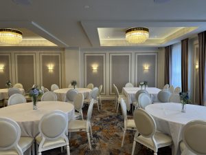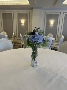 To carry the look through the room, we styled the guest tables with small and intimate centrepieces in baby blue and spring tones. These designs kept the tables fresh and elegant without overpowering the space. They added colour, softness and just the right amount of detail for a family event where comfort and atmosphere mattered equally.